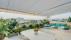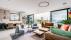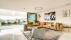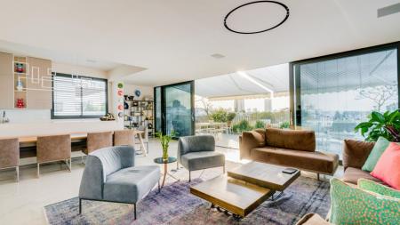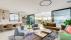 Large living room with open kitchen and balcony with seating areas